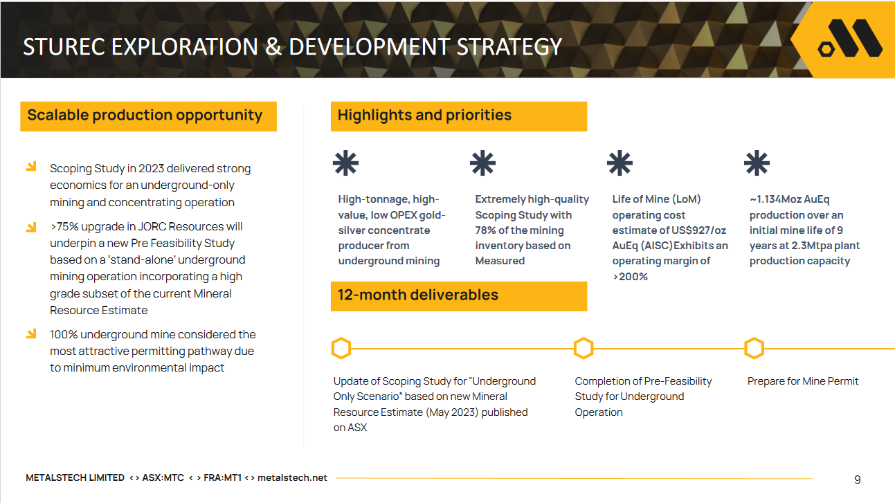 Die Australier arbeiten an der Sturec Gold Mine (historische Produktion 1.5 Moz) in der Slowakei. Zurzeit weisen sie 1.6 Moz AuEq aus. Die MC beträgt 52 Mio. AUD, Ende April hätte die Scoping Study (PEA) erscheinen sollen. Geplant ist eine kompinierte Openpit/UG Mine mit jährlich 100'000 Oz. Das Explorationsziel liegt bei bis zu 5 Moz.