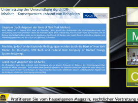 Jeder, der russische ADR oder GDR besitzt, fürchtet aktuell um sein eingesetztes Kapital. Der Umtausch in russische Aktien könnte dabei ein wichtiger erster Schritt zur Kontrolle über das eigene Vermögen sein. In diesem aktuellen SdK-Seminar geben wir Auskunft über die neuesten Ereignisse und Möglichkeiten und klären aktuelle Fragen. Mit dabei sind Vorstandsvorsitzender Daniel Bauer, Vorstandsmitglied Dr. Marc Liebscher, Rechtsanwalt Dr. Wolfgang Schirp und Rechtsanwalt Dr. Oleg Mosgo aus Russland.