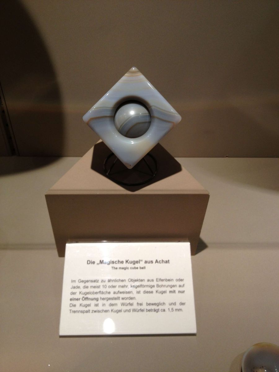 Zum Thema Steinbearbeitung habe ich eine Unerklärlichkeit beizusteuern. Im Edelsteinmuseum in Idar Oberstein hatte ich vor Jahren mal einen Achatwürfel fotografiert, der aus einem Stück eine lose drehende Kugel im Inneren hatte. Wir kennen die sog. Contrefait Kugeln, meist aus Elfenbein, wo sich im Inneren bis zu 10 einzelne, frei drehbare, weitere Kugeln befinden. Diese Kugen haben aber alle mehrere Durchbrüche/Öffnungen an den Seiten.