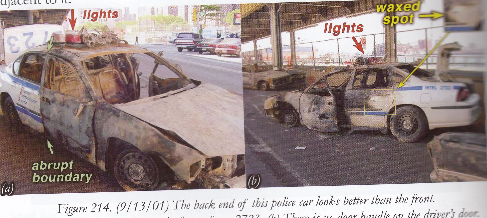 Habe das Buch eben ausgepackt und geblättert. Hier ein Scan von einem Foto (es sind tausende Bilder enthalten), wusste jemand, dass ein kilometerweit entfernter Carpark völlig irreguläre Totalschäden an über 1.000 geparkten Autos hatte? Dass es leichtentzündliche Stoffe gab, die unbeschädigt neben total pulverisierten Autositzen lagen?