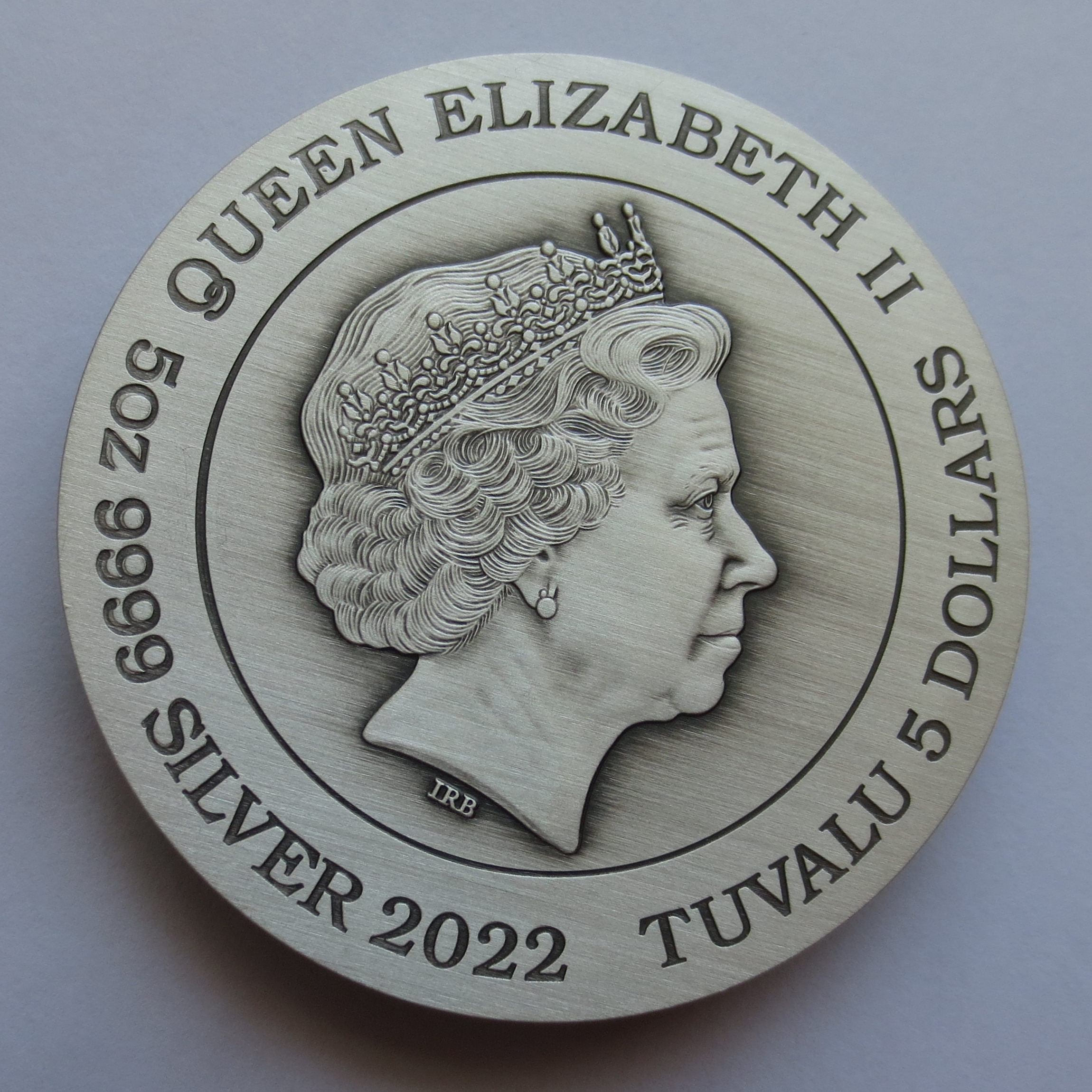 Die Legende: QUEEN ELIZABETH II, das Datum und die Stückelung: TUVALU 5 DOLLARS, erscheinen ebenfalls. Die Legende: 5 OZ 9999 SILVER 2022, identifiziert das Gewicht, die Reinheit und das Prägedatum.