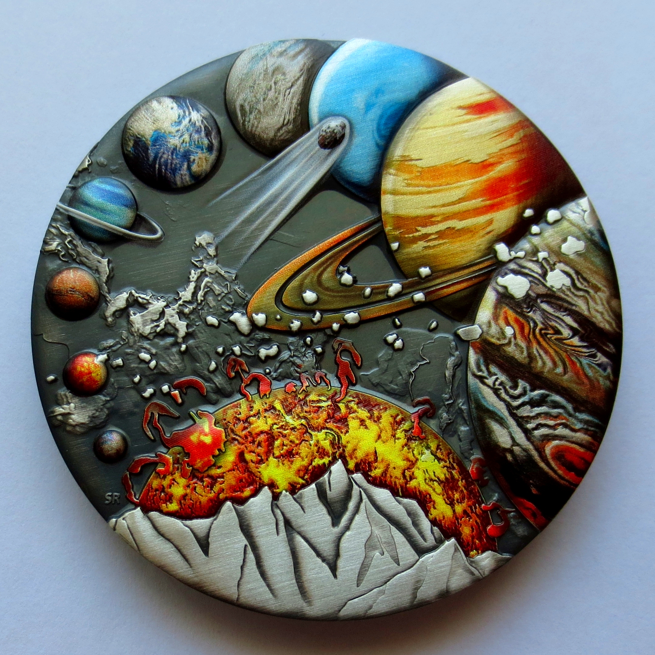 Die Münze "Planets of the Solar System" mit einem Nennwert von 5 Dollar wurde im April 2022 Tuvalu herausgegeben, besteht aus 5 Oz (155,553 Gramm) reinem Silber, hat einen Durchmesser von 55,9 mm, ist 7,5 mm dick und ist in Antik Finish veredelt und zudem coloriert. Sie ist auf eine Auflage von 388 Stücke, limitiert, in einer Kunstleder-Präsentationsbox (Etui) im Clamshell-Stil untergebracht und wird durch eine vollfarbige Außenbox geschützt. Jede Münze erhält ein individuell nummeriertes Echtheitszertifikat, das auch eine kurze Beschreibung des Sonnensystems enthält.