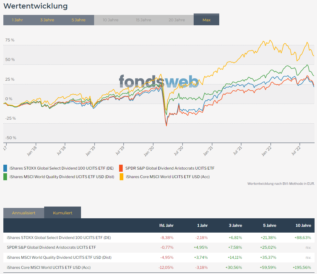 Wenn man sich den kumulierten Gesamtertrag anschaut, dann überzeugen Dividendenstrategien auch nicht wirklich. Anbei ein Vergleich zwischen MSCI World und den drei größten globalen Dividenden-ETFs: