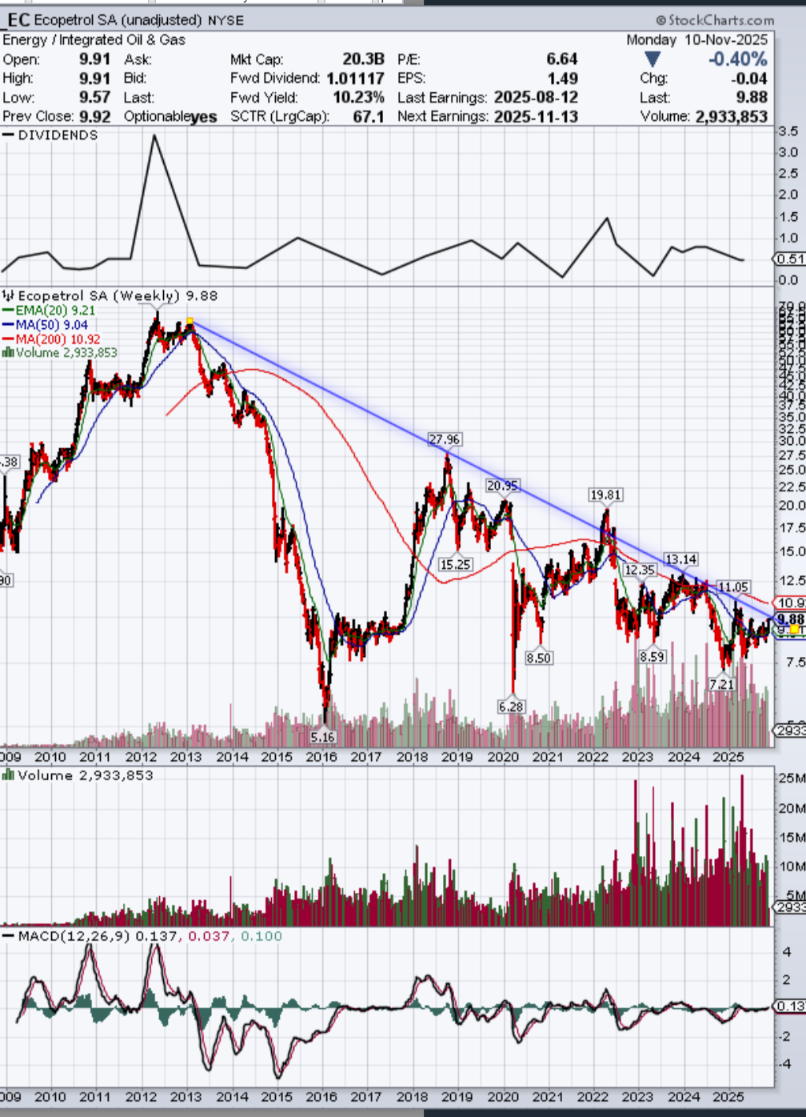 • Habe Ecopetrol als Dividendenaktie im Blick. Man müsste evtl. ein präziseres Tool benutzen - würde aber sagen das ist noch kein Ausbruch aus dem Abwärtstrend.