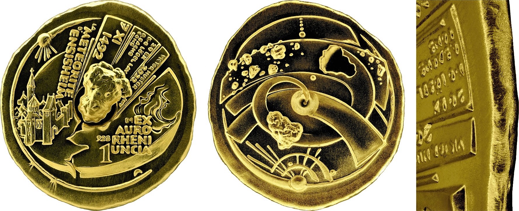 Im Rahmen der Münchner Mineralientage 2022 hatte ich die Gelegenheit, eine Sammlervitrine zum Thema „Meteorit von Ensisheim – Flussgold aus Ensisheim“ zu gestalten. Damit war der Schwerpunkt zum Meteorit von Ensisheim (gefallen am 7. November 1492) mit der 2022 entstandenen Medaille aus Ensisheimer Flussgold im Kern vorgegeben. Ein bergbauliches Thema, welches nicht nur das Rheingold aus dem französischen Elsass betrifft. Es ging auch um moderne Flussgoldmedaillen aus Elbegold, Edergold, Donaugold, Isargold, Maingold und aus dem Flussgold des Bayerischen Waldes. Ein unbekanntes und durchaus reizvolles Thema besonderer moderner Goldgepräge, welches im Rahmen der Münchner Mineralientage 2022 erstmals vorgestellt wurde und welches auf ein großes Interesse und eine gute Resonanz gestoßen ist (siehe Fotos mit dem Geschäftsführer Ch. Keilmann und der Deutschen Edelsteinkönigin). Leider zieht sich mein Buchthema „Kleinode aus den Flussablagerungen Deutschlands, mit den grenznahen Gebieten der Nachbarländer Österreichs, der Schweiz und Frankreichs“ noch etwas hin (siehe http://www.rauhgold.de). Da ich zusammen mit einem Freund alle Fotos mittels Stack-Fotografie erstelle bzw. erstellen möchte (derzeit sind es über 800 hochaufgelöste Bilder) und dieses Projekt daher noch etwas Zeit benötigt, mache ich gerne auf den soeben erschienenen Katalog „Flussgold- und goldene Bergbaugepräge“ von Lothar Schumacher aufmerksam. Zumal der Katalog in einer sehr kleinen Auflage erschienen ist und folglich bald vergriffen sein wird. Dieser Katalog gibt nicht nur einen exzellenten Überblick über die historischen Stücke, nein, der Katalog enthält auch alle modernen Gepräge aus Flussgold – einschließlich der teilweise extrem seltenen Proben. Falls jemand Interesse an solchen goldenen Erzeugnissen hat, dem sei dieser Katalog wärmstens ans Herz gelegt.