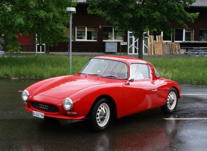 Aus dem Beitrag 590 habe ich eines der kleinen Fotos vergrößert, um Details der NSU deutlicher zu zeigen, Rechtes Foto. In deren Hintergrund sind Teile eines Sportwagens zu erkennen, ein DKW MONZA.