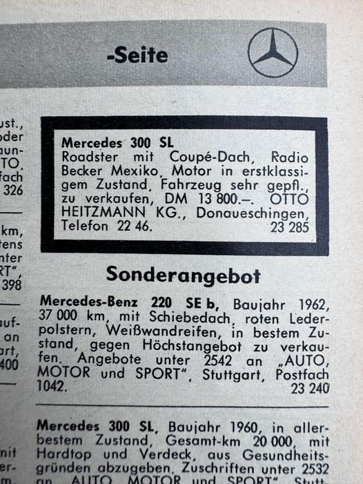 diese Anzeige dürfte so. ca, um 1970 sein, der Preis für den gebrauchten SL, ca 8 Jahre geht voll ok, ist damals ein Durchschnittsjahreseinkommen gewesen.