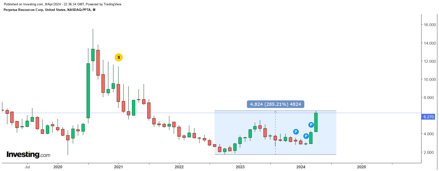 PPTA ist im Vgl. zu ähnlichen Companys (z. B. Integra, Skeena, Ascot, Marathon) viel günstiger bewertet. Die MC beträgt nur 9 % des NAV (Ascot 43 %). Anbetracht der Lage (Idaho), der günstigen Bewertung, des Antimoniumanteils und des Supports durch die USA habe ich mir eine kleine Position zugelegt. In diesem Prügelknaben steckt m. E. hohes Aufwärtspotential. Die Bodenbildung ist erkennbar.