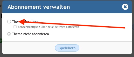 Wenn du in das Thema reinklickst kannst du oben rechts das Thema abonnieren, oder es wird auch automatisch abonniert sobald du einen Post verfasst.
