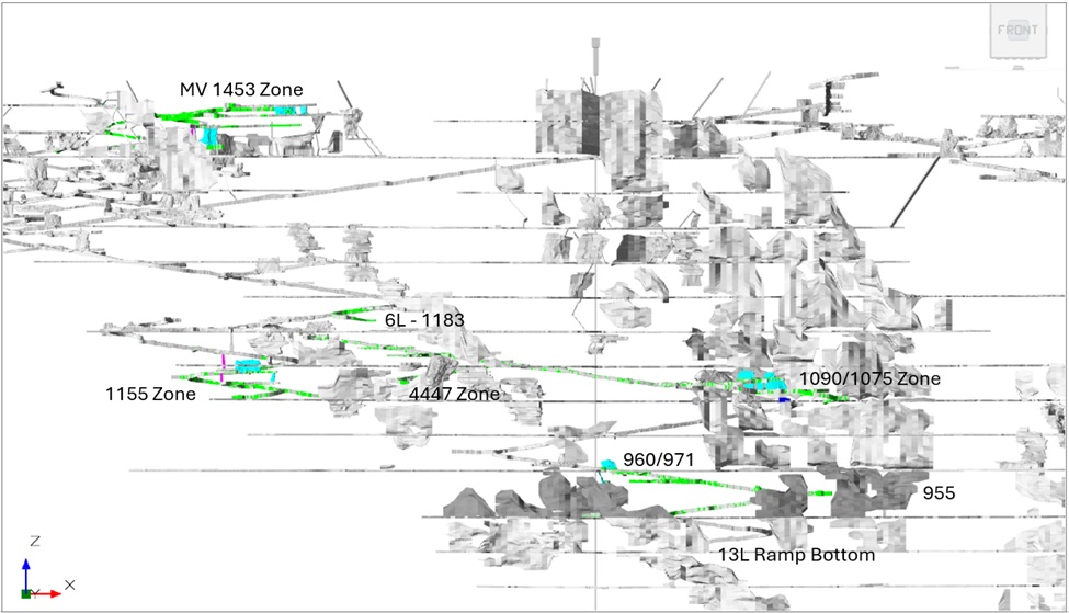 Testbergbau - Nachdem sie die ersten erztragenden Entwicklungsstrecken vorangetrieben hatten, begannen unsere Crews Ende 2024 mit dem Testabbau. Wir wollen unsere Fähigkeit verbessern, sicher und effizient zu schürfen, und wir wollten die besten Möglichkeiten zum Bergbau in der Nähe historischer Haltestellen bestimmen. Wir lagerten das abgebaute Material separat, als Stop-by-Stop-Stop-Bulkproben, und verarbeiteten sie dann in Stapeln, um die gemahlenen Qualitäten mit dem geologischen Modell in Einklang zu bringen.