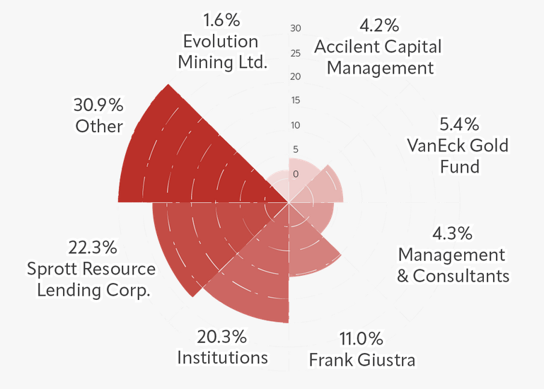 "Giustra hatte früh 2022 eine 18 % Beteiligung erworben VOR der Übernahme von Madsen und ist jetzt mit 11 % beteiligt, Sprott mit 22,3 % und das Management mit 4,3 %. Allein diese 37,6 % "Feste Hände" sind rel. starke Beteiligungen."