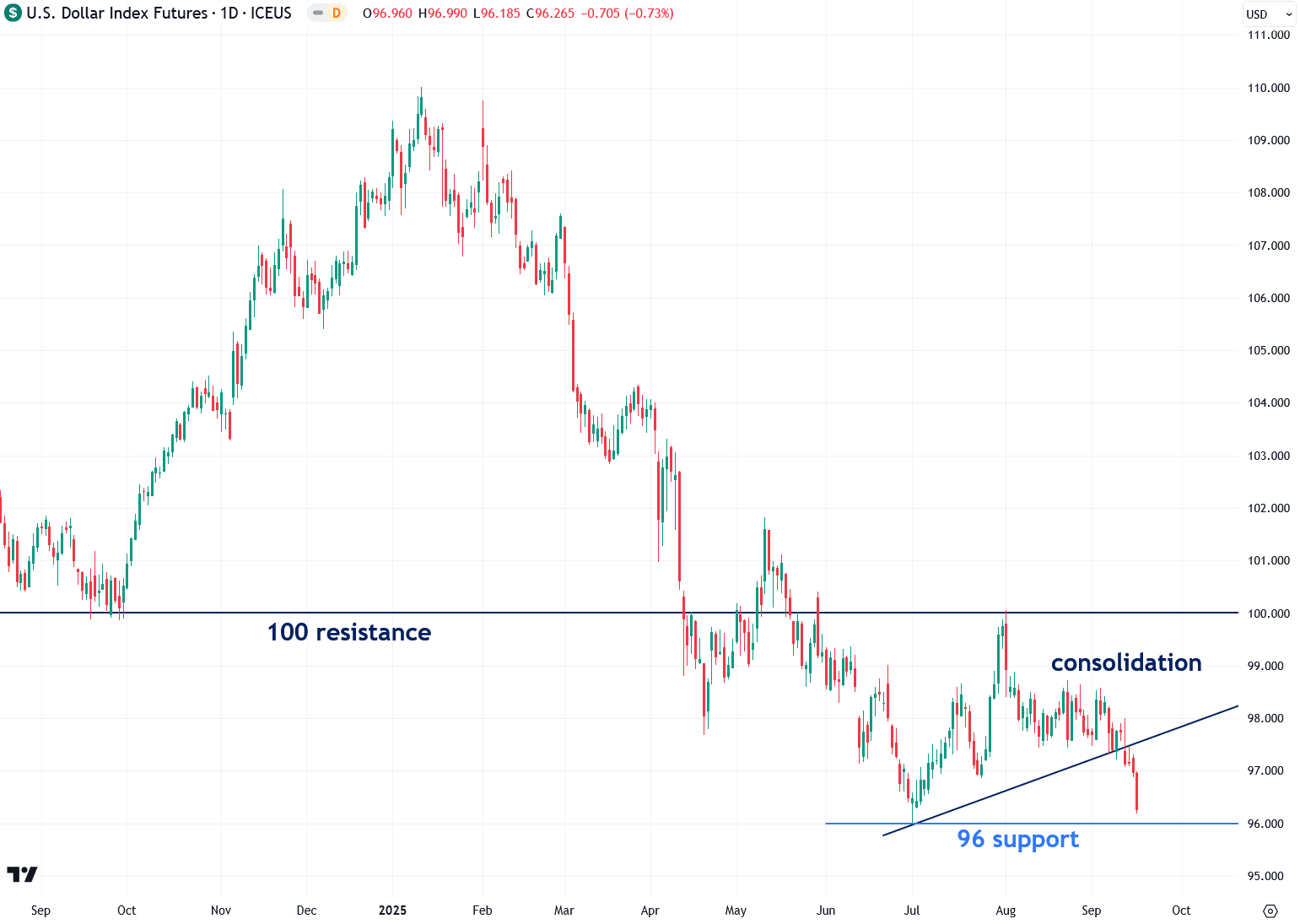 Bereits im April, den USA. Der Dollar Index schritt unter das kritische Niveau von 100, das als wichtiger technischer Support bis 2023 gedient hatte. Dieser Zusammenbruch signalisierte mir, dass weitere Schwäche wahrscheinlich vor mir liegt. Seitdem konsolidiert sich der Dollar-Index, da er auf Klarheit über zwei Hauptfaktoren wartet: das Tempo und das Ausmaß der bevorstehenden Fed-Fonds-Rate-Kürzungen und wen Präsident Trump als nächsten Fed-Vorsitzenden nominieren wird.