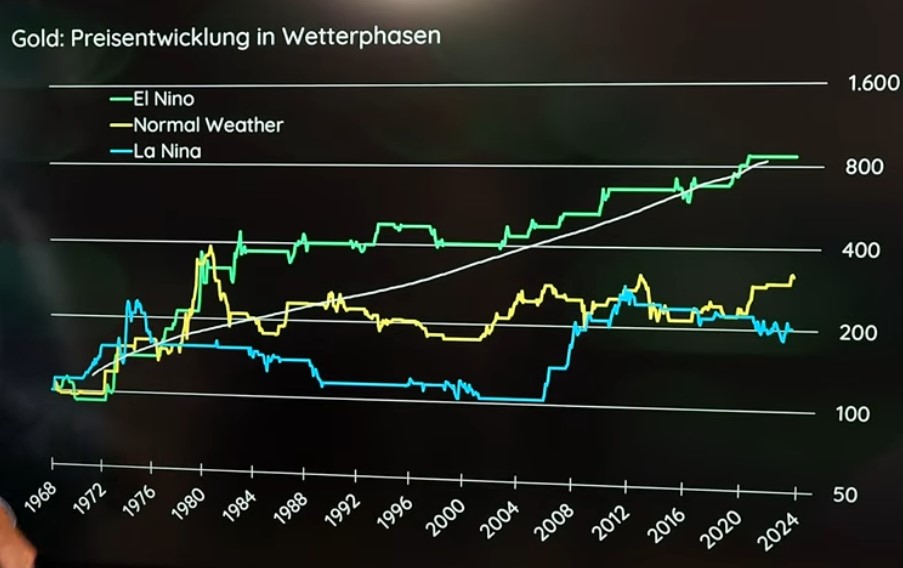 Hier ist wohl nicht der absolute Goldpreis sondern wohl die Differenz dargestellt. Weisse Linie soll einfach nur so mal den Trend (von grün = El Nino Jahren) darstellen.