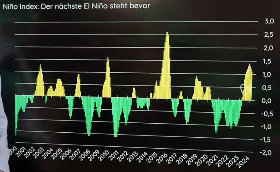 Hier ist wohl nicht der absolute Goldpreis sondern wohl die Differenz dargestellt. Weisse Linie soll einfach nur so mal den Trend (von grün = El Nino Jahren) darstellen.