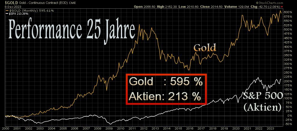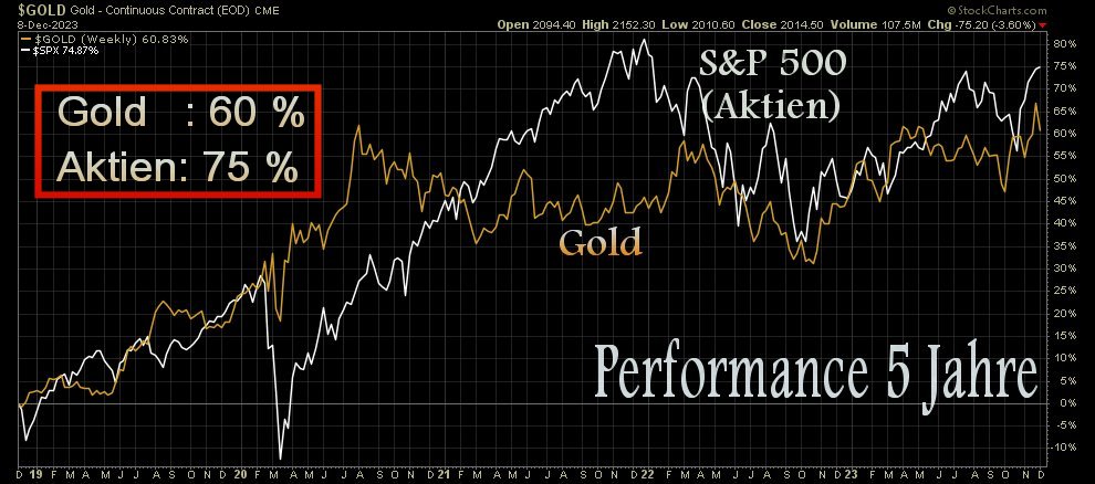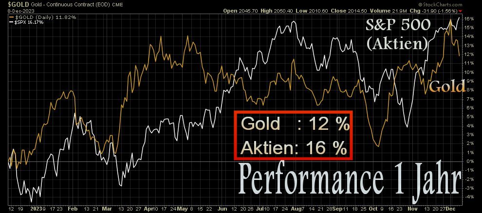 "Der Preis für Gold ist in der Nacht zum Montag auf ein Rekordhoch von 2135 US-Dollar je Unze gestiegen. Noch nie war das Edelmetall so teuer. Zur Verblüffung vieler Börsianer ist Gold damit zu einer der besten Geldanlagen im Jahr 2023 geworden - und das, obwohl es auf Gold keine Zinsen gibt, auf viele Kapitalanlagen aber durchaus wieder einträgliche Renditen.