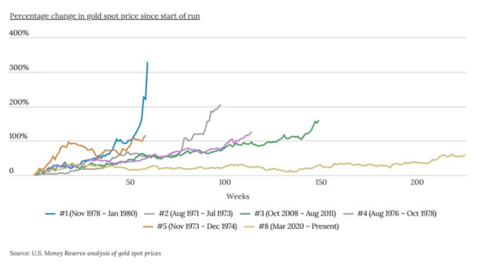 "Kitco News - Gold hat eine lange Geschichte als verlässlicher Wertaufbewahrer in Zeiten wirtschaftlicher Unruhen, und laut einer Analyse der größten Preisanstiege des gelben Metalls in den letzten 50 Jahren "befindet sich der Markt jetzt in einem länger andauernden Goldpreisanstieg als je zuvor, seit die USA den Goldstandard im August 1971 vollständig aufgegeben haben."