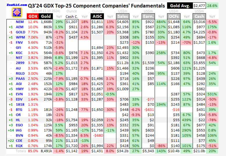 Diese Tabelle fasst die operativen und finanziellen Highlights der GDX Top 25 im dritten Quartal 2024 zusammen. Die Aktiensymbole dieser Goldminenunternehmen sind nicht alle in den USA notiert, und ihre Ranglistenänderungen innerhalb des GDX im letzten Jahr gehen ihnen voraus. Die Umschichtung ihrer ETF-Gewichte spiegelt die sich ändernden Marktkapitalisierungen wider, die seit dem dritten Quartal 2023 sowohl Outperformer als auch Underperformer offenbaren. Diesen Symbolen folgen ihre aktuellen GDX-Gewichte.