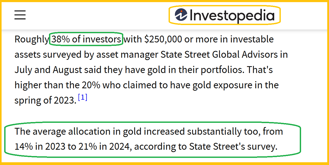 Laut State Street und Investopedia tuen dies die Anleger im Westen zunehmend und 54 % dieser Anleger investieren lieber in physische Goldbarren als in ETFs, Futures usw."