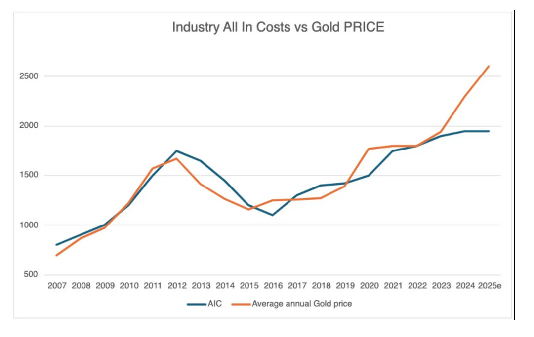 Die Gewinnspannen der Goldminen sind fett, und sie werden mit dem weiteren Anstieg des Goldpreises noch fetter....(sh. Chart)