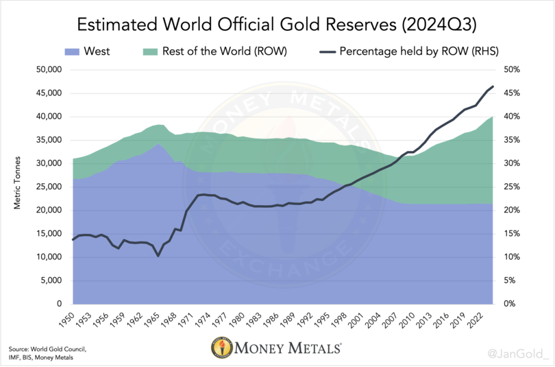 "Der Anteil der weltweiten offiziellen Goldreserven, die nicht bei der Federal Reserve Bank in New York (FRBNY) und der Bank of England (BOE) in London gelagert werden, ist von 51% im Jahr 1972 auf 78% im Jahr 2024 gestiegen. Die Verschiebung dieses Verhältnisses scheint sich zu beschleunigen und kann als Indikator für den Rückgang der finanziellen Dominanz des Westens gesehen werden....