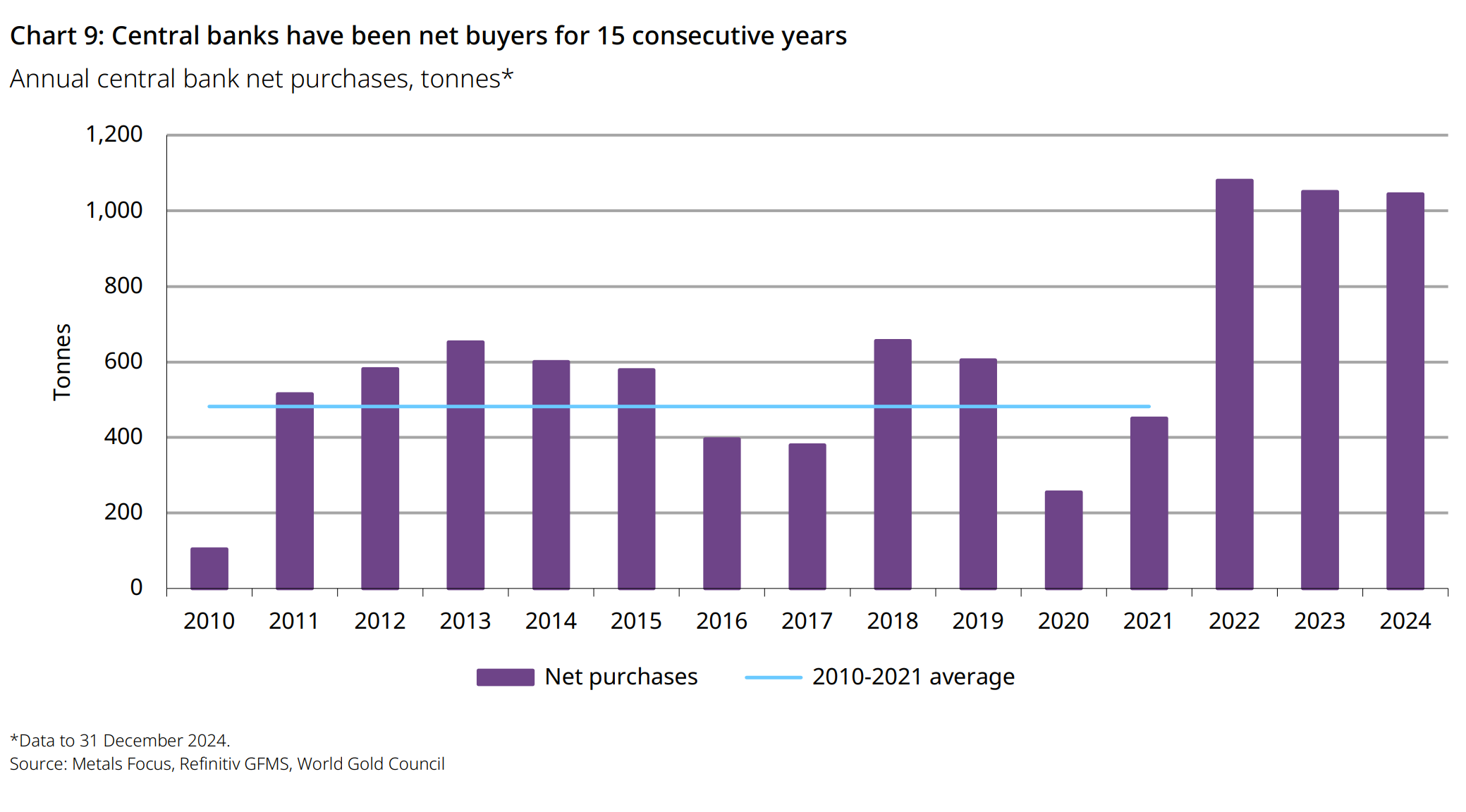 "Die Zentralbanken dominieren weiterhin den Goldmarkt, indem sie im Jahr 2024 das dritte Jahr in Folge mehr als 1.000 Tonnen Gold kaufen und im vergangenen Jahr rund 20 % der Gesamtnachfrage auf sich vereinten.(Anm: Die zuvor erwähnten geheimen Goldkäufe der ZB China sind wohl nicht erfaßt, Edel)