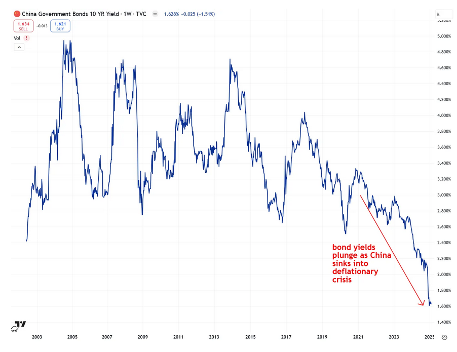Ein wichtiger Katalysator für eine mögliche chinesische Goldmanie sind die schweren wirtschaftlichen Turbulenzen des Landes. Durch den Einbruch der Immobilien- und Aktienmärkte wurden schätzungsweise 18 Billionen US-Dollar an Haushaltsvermögen vernichtet - eine Wirtschaftskrise, die mit Chinas Version der Großen Rezession von 2008 vergleichbar ist. Inzwischen sind die Renditen von Staatsanleihen auf Rekordtiefs gefallen, was auf eine sich vertiefende Deflationsspirale hindeutet....(sh.Chart 2 !)
