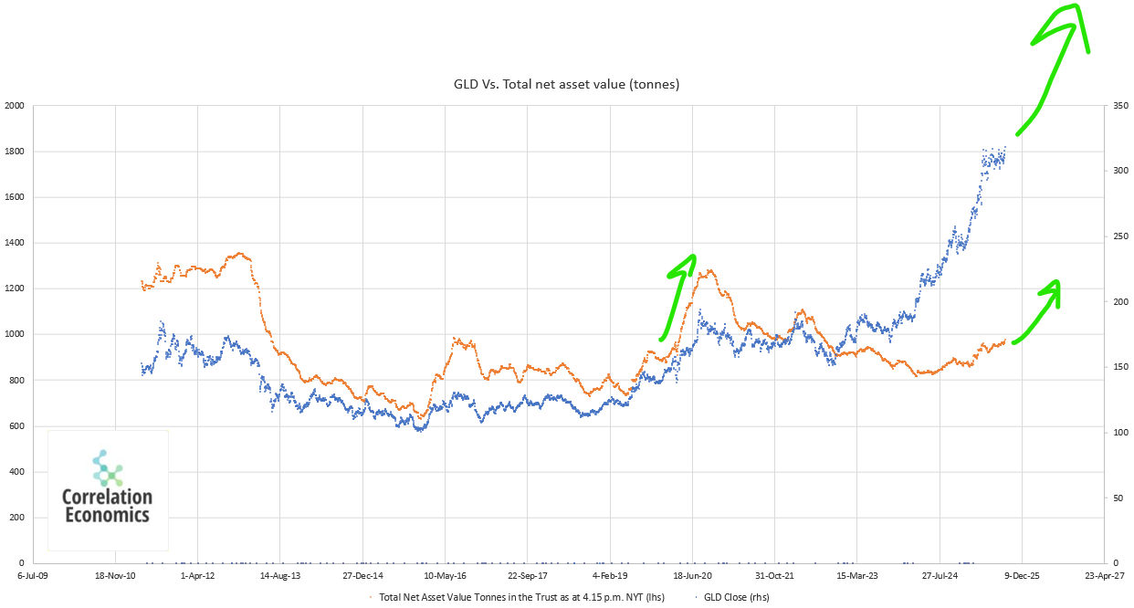 Weil ein Bild mehr als 1000 Worte sagt: die linke Skala und orange Linie ist das Inventar des GLD in Tonnen. In blau der Preis, rechte Skala.