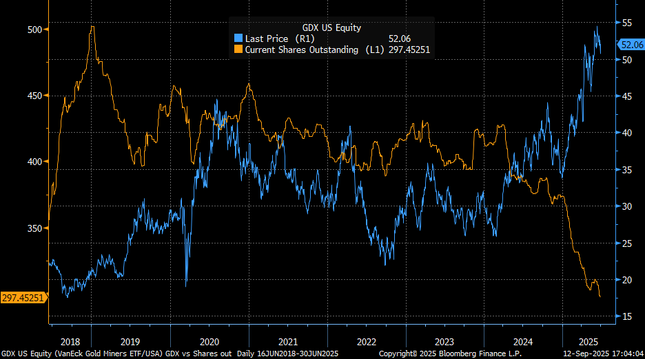 GDX shares new low at 297 mil🤡. Investors have been selling the GDX not buying it. Yes market cap is high due to value driven into the miners by rising Gold.…