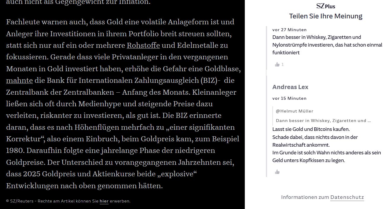 die Schreiberlinge wittern künftigen „Ruhm“, weil sie glauben, dass Gold ja jetzt so teuer sei, es nur noch runter gehen kann und ihre Aussage eine eintreffende Prophezeiung sein wird. Mit ihren tradierten Denkmustern übersehen sie, dass die empfohlenen Zinseszinsanlagen gegen Null tendieren werden. Eine wirksame Altersvorge besteht aus Sachwerten und in der Hauptsache aus Edelmetallen!