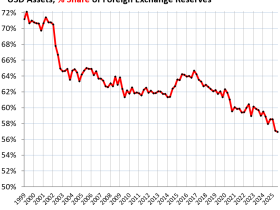 Der Anteil der auf USD lautenden Vermögenswerte anderer Zentralbanken sank im dritten Quartal auf 56,9% der gesamten Devisenreserven, den niedrigsten Stand seit 1994, von 57,1% im zweiten Quartal und 58,5% im ersten Quartal, so die neuen Daten des IWF zur Währungszusammensetzung der offiziellen Devisenreserven.