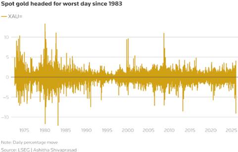 Zweifellos gab es auch Gewinnmitnahmen, da der Goldpreis bis 2025 um sage und schreibe 66 % gestiegen war und Händler gezwungen waren, zu verkaufen, um Nachschussforderungen zu decken.