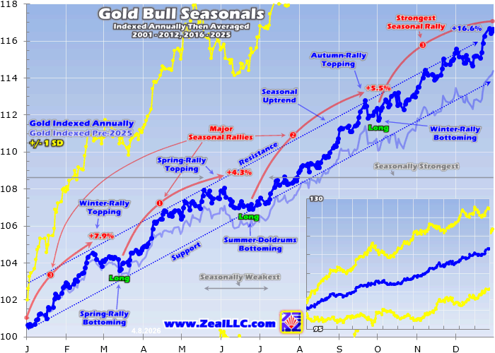 Diese verzerrte, von Relikten geprägte Denkweise beginnt sich zu ändern, wie der Goldpreisanstieg von 64,3 % im Jahr 2025 beweist! Dieses massive Aufwärtsjahr hat den saisonalen Durchschnitt des Goldpreises deutlich erhöht, wie diese Grafik zeigt. Gold verzeichnet drei große saisonale Aufwärtsbewegungen: Im Herbst liegt der Durchschnitt bei 5,5 %, gefolgt vom Winter mit 7,9 % – dem stärksten Anstieg – und schließlich dem Frühling mit bescheidenen 4,3 %.