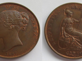 An den Halfpenny der Isle of Man kommt dieses Stück nicht ran, dennoch ist es von der Erhaltung her interessant. In der Hand und auch noch unter einer guten Lupe ist es ein 1-A-Stück. Mit partiellem, leicht flackerndem Glanz in den Feldern. Gegen einen EA sprechen die Stempelbrüche. Möglicher Weise wurde es irgendwann einmal schonend gereinigt und ist dann nachgedunkelt. Ein besseres zu finden, ist gewiss keine leichte Aufgabe. Und ganz gewiss kein preiswertes Vergnügen. Sowas kann man nur kaufen, wenn man nicht danach sucht.