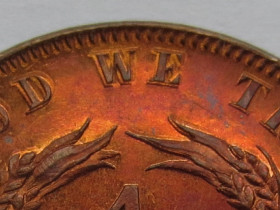 • Liberia 1 Cent 1890, hergestellt als PP im Stoßglanzverfahren, siehe Ausschnitt.
