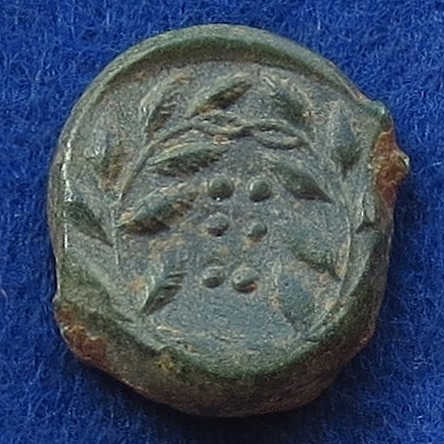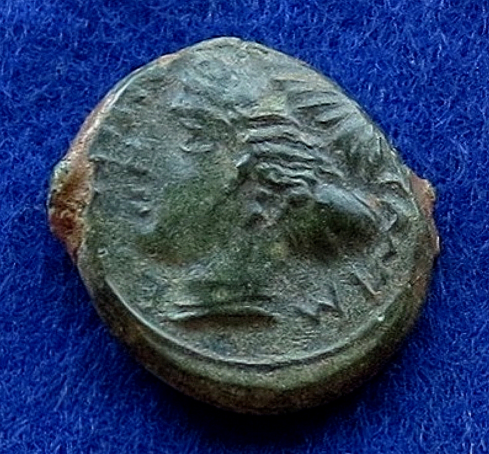 Die grüne Römerbronze (moesia Inferior, Caracalla, etwa vz) hat eine nahezu prefekte Malachitpatina. Sie zeigt, für Bronzen mit Malachitpatina selten, teils noch die für Heißprägungen typischen Prägeriefen und die Spuren der Graviereisen beim Gravieren bzw. Nachschneiden der eingesenkten Details.