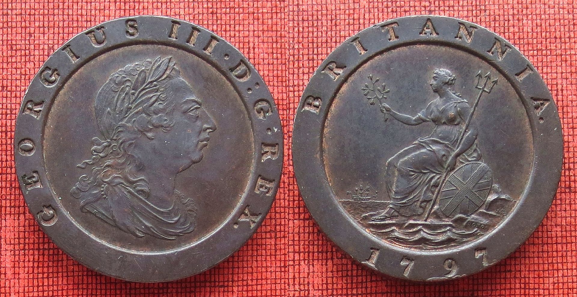 Zusammen mit dem 1797er Carthwheel-Penny ist es die erste offizielle Kupfermünze Großbritaniens, die mit einem Prägeautomaten geprägt wurde, der seine dazu notwendige Kraft durch eine Dampfmaschine erhielt. Und das 2-Pence-Stück von 1797 ist die schwerste, jemals geprägte britische Kupfermünze. Superlative ohne Ende - beliebt war sie nicht, daher wurde sie nur 722.000 mal im Jahr 1797 geprägt.