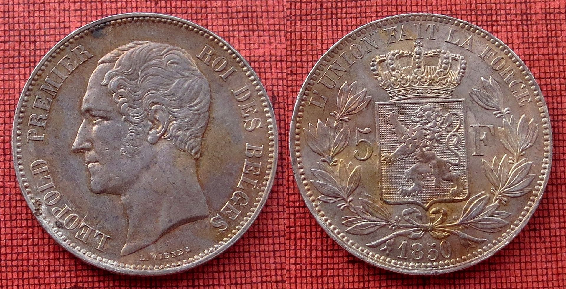 • Belgien 5 Francs 1850 und ein besonders gut ausgeprägter Pfennig Karls des Kahlen aus Rennes, beides etwa vz+ erhalten, dazu noch ein stempelfrischer Pfennig Heinrich des Zänkers vom Münzmeister "ELLIN"