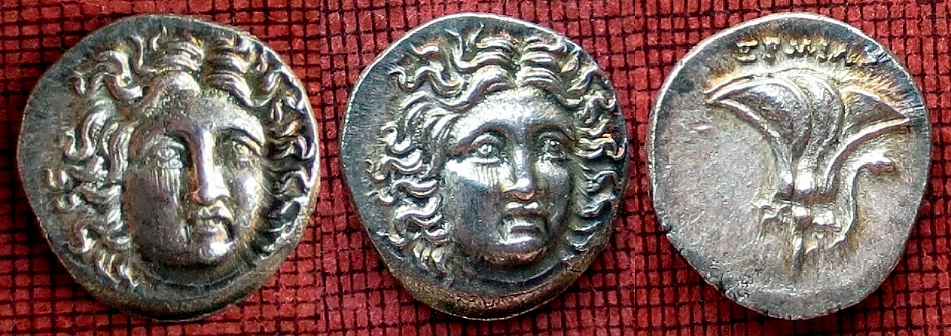 Im Jahr 1968 wurden in Thessalien, nahe Pharsalos bei Sitichoro, ein Münzfund mit etwa 2000 bis 3000 Münzen entdeckt. Der Fund ist unter den Namen „Sitichoro-Hoard“ und „Larissa-Hoard“ bekannt. Die am häufigsten vorkommenden Münzen stammten aus Rhodos und machten etwa die Hälfte des gesamten Fundes aus. Darunter befanden sich 500 bis 600 leichte Tetradrachmen des Makedonen Perseus. Die Tetrabole oder leichten Drachmen, trugen alle den Magistratsname Hermias über der Rose auf der Rückseite. Vor 1968 waren solche Tetrobole oder Leichte Drachmen mit dieser Inschrift unbekannt. Die Münzen dieses Typs wiesen allesamt keinerlei Gebrauchsspuren auf, sind aber häufig dezentriert, manche Münzen weisen Doppelschläge, Unebenheiten oder Prägerisse auf und sehr viele Münzen wurden unter Benutzung verrosteter Stempel oder Urwerkzeuge (Patritzen) geprägt. Das Gesicht (Wangen unterhalb der Augen) wurde vielfach nachbearbeitet, um die Rostspuren zu kaschieren. Mein sehr gut ausgeprägtes Stück ( der Grad der Ausprägung ist gut an der Form der Nase erkennbar) zeigt derartige Nachbearbeitugsspuren sehr deutlich /unter den Augen und im Bereich des Mundes).
