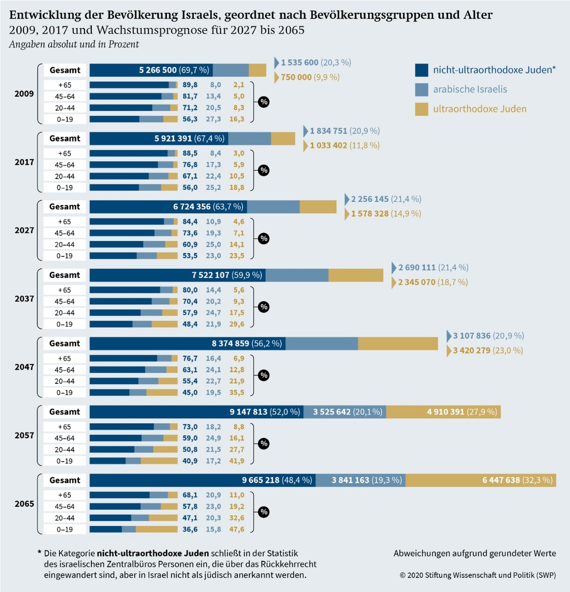 Aus dieser Grafik von 2018 kann man gut ersehen, warum ohne die Charedim (demnächst) in Israel gar nichts mehr geht. Es wird davon ausgegangen, dass im Jahre 2065 bereits fast 50 % der Jungen Kohorte dieser ultraorthodoxen Gruppierung (voraussichtlich) angehören werden. Das dürfte einer der Gründe sein, warum Netanjahu jetzt eskaliert (solange die Israelis noch können), bevor die Kriegsdienstverweigerer (ist ja aktuell wohl auch schon aufgeweicht) die Überhand bekommen.