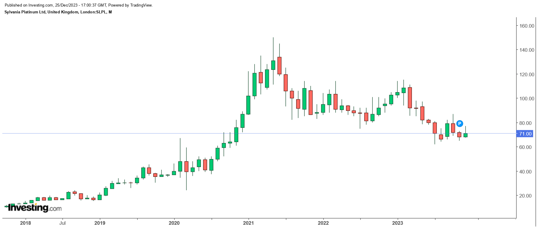 Sylvania ist ein kleiner feiner PGM-Produzent aus Südafrika. Er betreibt 6 Minen, die jährlich 75 Toz 4E PGM (platinum, palladium, rhodium and gold) produzieren. Der Umsatz betrug im Geschäftsjahr 2022/2023 (Endet im Juni) 130 Mio USD. Die MC beträgt 186 Mio GBP. Gehandelt wird Sylvania in London.