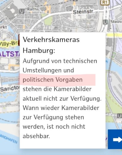 • Das gilt doch seit Beginn des Krieges in der Ukraine ... zumindest in Hessen wurden zu Beginn der Materialtransporte die Übertragung der Verkehrskameras ins Web mit exakt dieser Meldung eingestellt und seit einigen Monaten sind die Links zu diesen Kameras gar nicht mehr vorhanden.