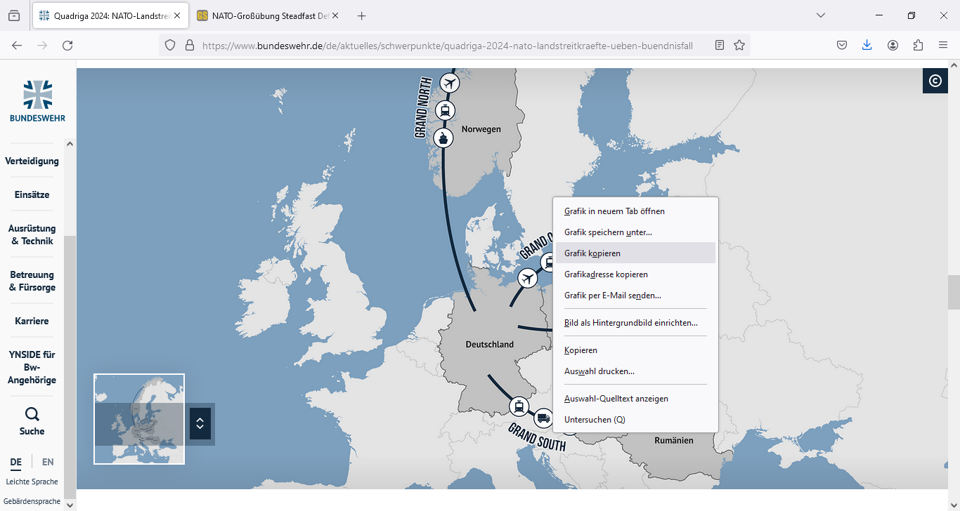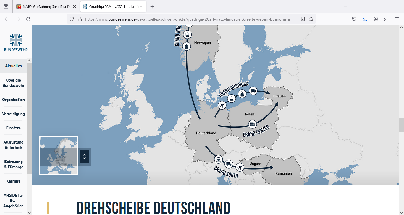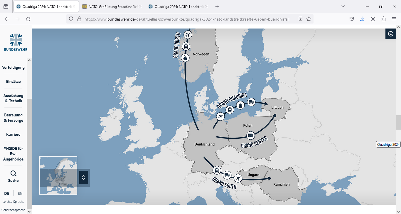 Das Heer der Bundeswehr beteiligt sich unter dem Dach von Steadfast Defender 2024 mit 12.000 Soldatinnen und Soldaten und 3.000 Fahrzeugen an einer Serie von vier Übungen, die wiederum als Quadriga 2024 bezeichnet wird. Das System der Bündnisverteidigung solle mit der Übungsserie einem Stresstest unterzogen werden, sagte der Inspekteur des Heeres, Generalleutnant Alfons Mais, im Vorfeld. Und Alfons weiß das ganz genau.