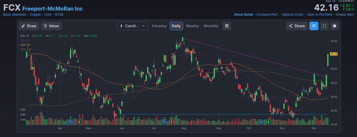 Auch der Kupfer und Goldgigant FCX profitiert naturgemäß von dem Hype bei Kupfer + Gold.