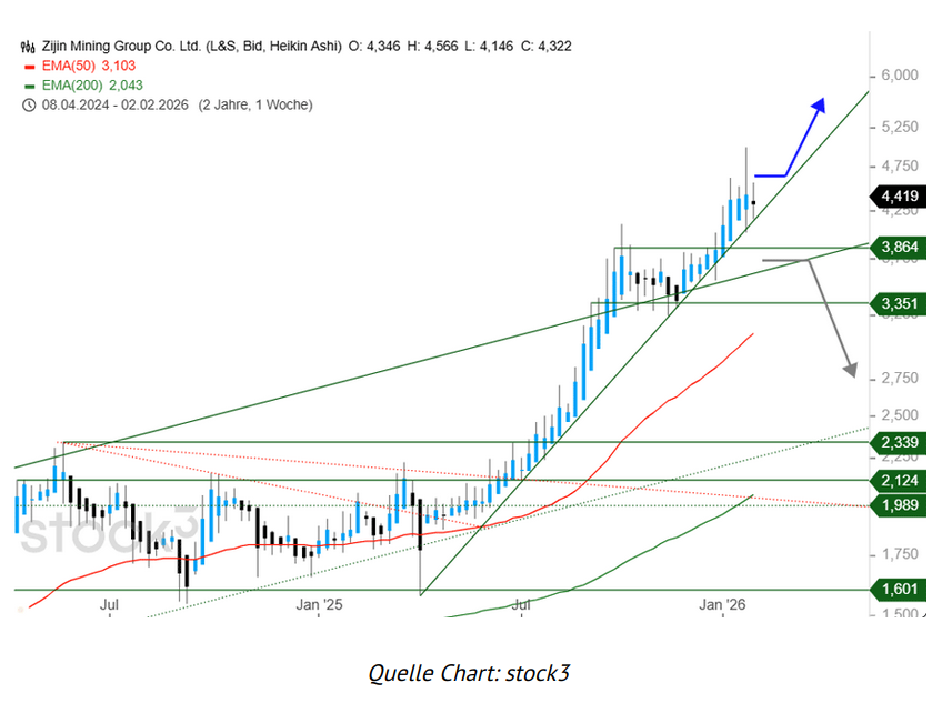 "Das chinesische Minenunternehmen Zijin Mining Group Co. Ltd. markierte, wie so zahlreiche andere Minen ebenfalls, im Januar einen historischen Höchststand. Dabei wurde beinahe die Marke von 5,00 EUR je Anteilsschein geknackt. Doch eben nur beinahe, und so bleibt dieses Niveau, nebst der darüber liegenden Marke von 6,00 EUR eines der nächsten Ziele dieser sich unverändert im Aufwärtstrend befindlichen Aktie. Wichtig dabei: die Verteidigung der kurzfristigen Aufwärtstrendlinie seit Ende November 2025. Oberhalb von 4,14 EUR bleibt die Lage somit weiterhin bullisch...."