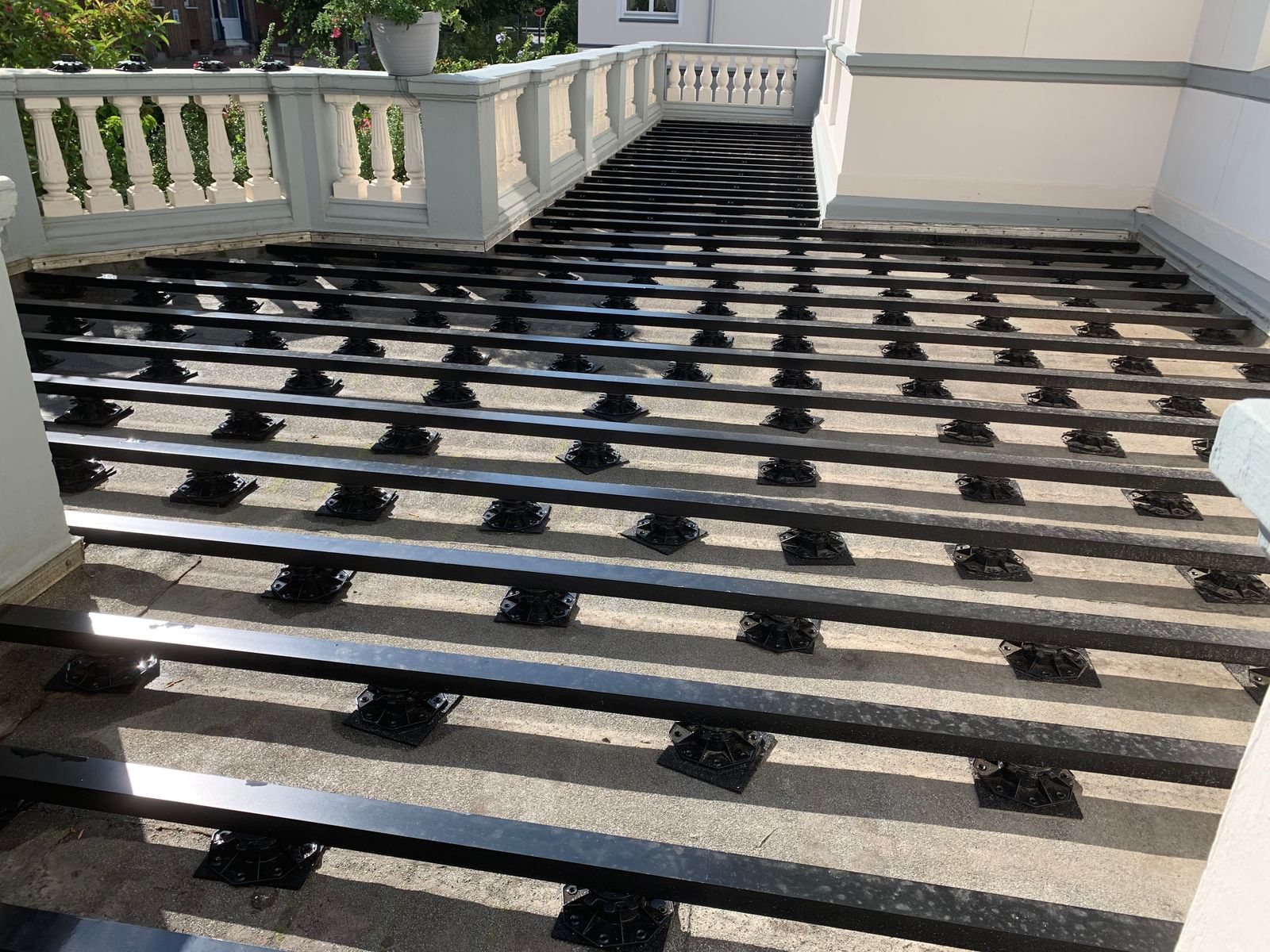 mal zur Abwechslung etwas aus dem Außenbereich. Eine große Veranda der Beletage habe ich mit neuen Belag versehen. Zuerst habe ich den Boden komplett mit Schweißbahnen abgedichtet (die Veranda ist voll unterkellert). Dann habe ich verstellbare Terrassenlager auf Unterlagen (Bautenschutzmatte) unter die Aluminiumunterkonstruktion geschraubt und anschließend mit 1% Gefälle (mind. 2 Meter Wasserwaage verwenden) ausgerichtet. Das sieht viel einfacher aus, als es ist (das hat 2 Tage gebraucht). Anschließend habe ich Faserzementdielen von CEDRAL mit Flugkrallen aufgeschraubt. Die sind zwar sehr teuer, halten aber ewig. Das Ergebnis sieht erst dann richtig gut aus, wenn man auch auf das Fugenbild achtet. Empfehlung von mir: Unbedingt spezielle Faserzement-Sägerblätter für die Stichsäge bzw. Kappsäge verwenden. Das ganze ist als One-Man-Show schon eine Herausforderung.
