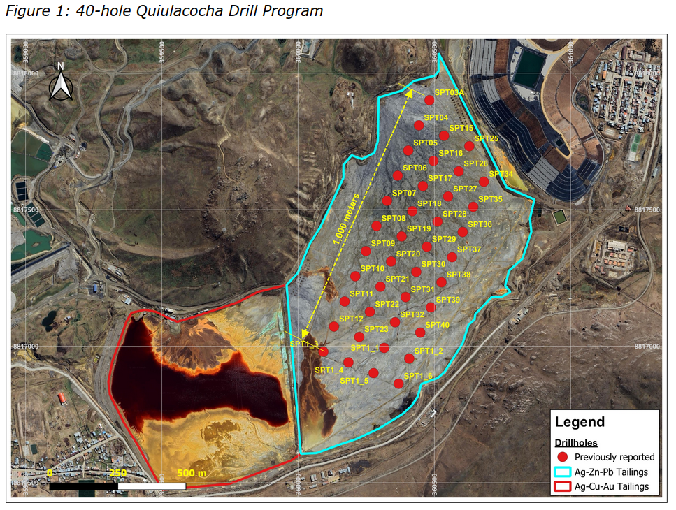 Die Bergelagerstätte Quiulacocha umfasst etwa 115 Hektar mit Abraumfällen, die von Anfang 1920 bis 1992 in der Quiulacocha Tailings Storage Facility (TSF) hinterlegt sind. Etwa 57 ha der Quiulacocha TSF liegt im Minenkonzession El Metalurgista von CDPR. Anfangs resultierten diese Berge aus dem Abbau von Kupfer-Silber-Gold-Mineralisierungen mit gemeldeten historischen Kopfgehalten von bis zu 10% Cu, 4g/t Au und über 300 g/t Ag und später aus dem Abbau von Zink-Blei-Mineralmaterial mit durchschnittlichen historischen Gehalten von 7,41% Zn, 2,77% Pb und 90,33 g/t Ag. Nach dem kürzlichen Erhalt der Regierungslandbeschäftigung initiierte das Unternehmen Ende August 2024 ein 40-Loch-Bohrprogramm.