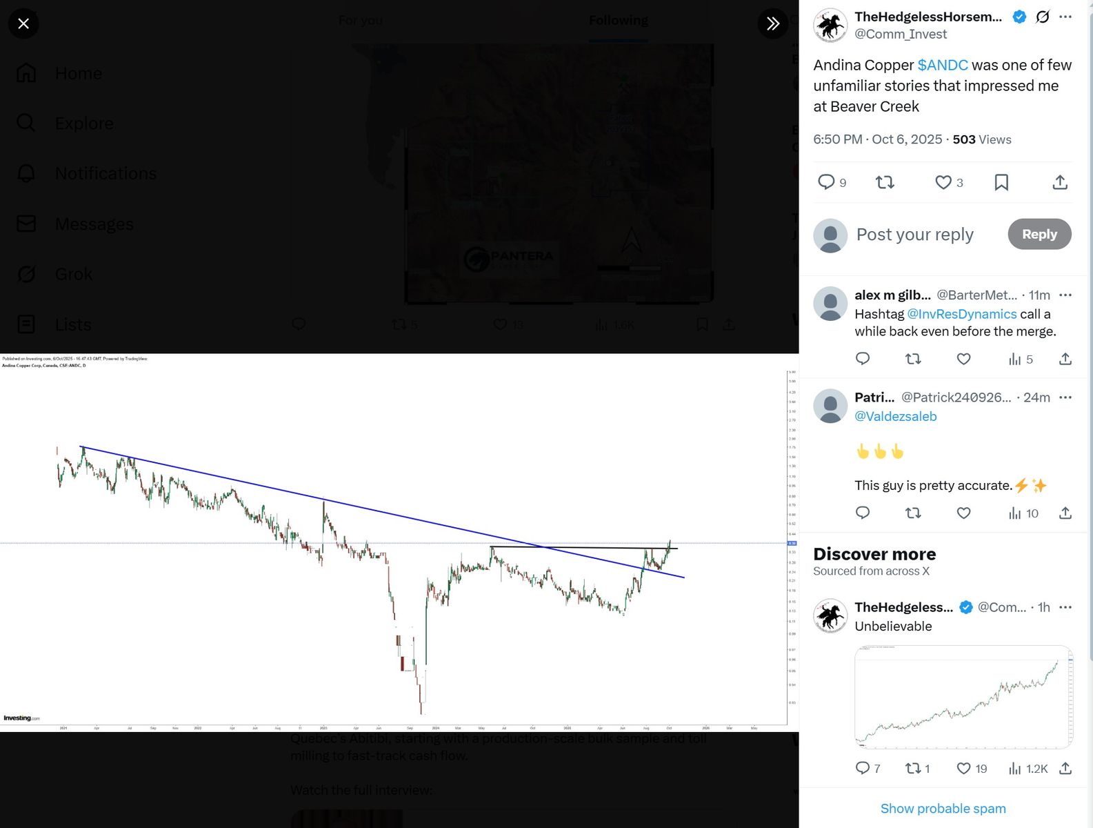 Da Andina Copper (vor ein paar Tagen noch Pampa Metals) hier unter dem Radar zu laufen scheint, wobei das nicht nur hier der Fall ist, und ich ohne einen Impuls aus diesem Forum sicher erst viel später auf dieses hidden gem gestoßen wäre, möchte ich gern den Faden für Andina hier eröffnen und dem Forum evtl. einen Tip zurück geben und sich evtl. folgenden Explorer mal genauer anzuschauen (Keine Anlageberatung, ich bin investiert, grad Explorer haben großes Risiko, macht eure eigene due dilligence).