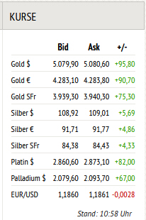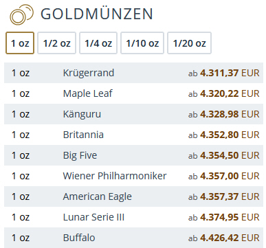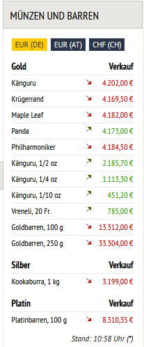 mir fällt auf, dass seit einigen Tagen die Preise in der Rubrik MÜNZEN UND BARREN auf der Startseite von Goldseiten.de nicht mehr aktualisiert werden. Da wird z.B. die 1 Uz-Gold Maple Leaf noch für 4.182 Euro angezeigt.