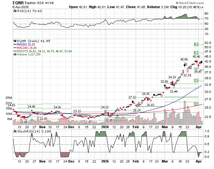 Obwohl charttechnisch extrem, steigt EQNR momentan um etwa 4 % auf 42,0 $ -- ATH ist 42,4 $ ![]()