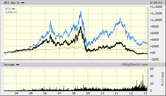 Nicht nur BTU, auch andere, zB Arch Coal / ACI, die noch ärger abstürzte. Hier mal ein 10 Jahreschart vs Versorger.